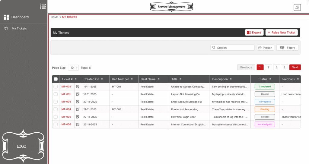 Stay updated with instant notifications and a central dashboard showing open tickets, SLA status, and team performance.